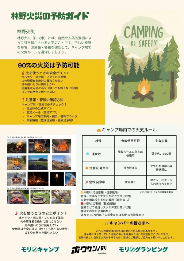 令和8年1月1日から運用が始まりました。消防法第22条に基づく「林野火災警報」が発令された場合、「火の使用の制限」として施設内でのたき火やキャンプファイヤー等が規制の対象となります。