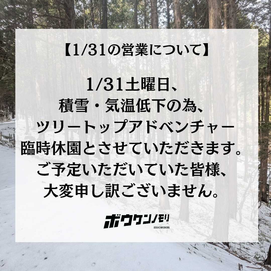 1月31日土曜日は、積雪・低温のため、ツリー トップ アドベンチャー(アドベンチャーコース・チャレンジコース・ジップライン)の営業を中止します。