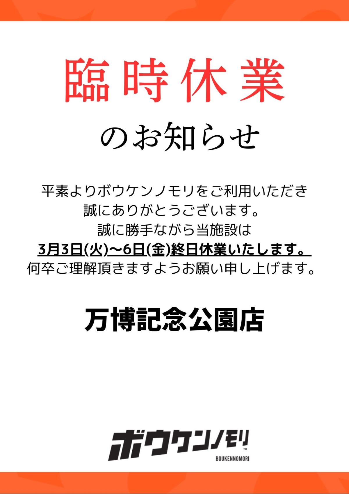 3月6日(金):臨時休業(より安全にお楽しみいただくための施設メンテナンスのため)