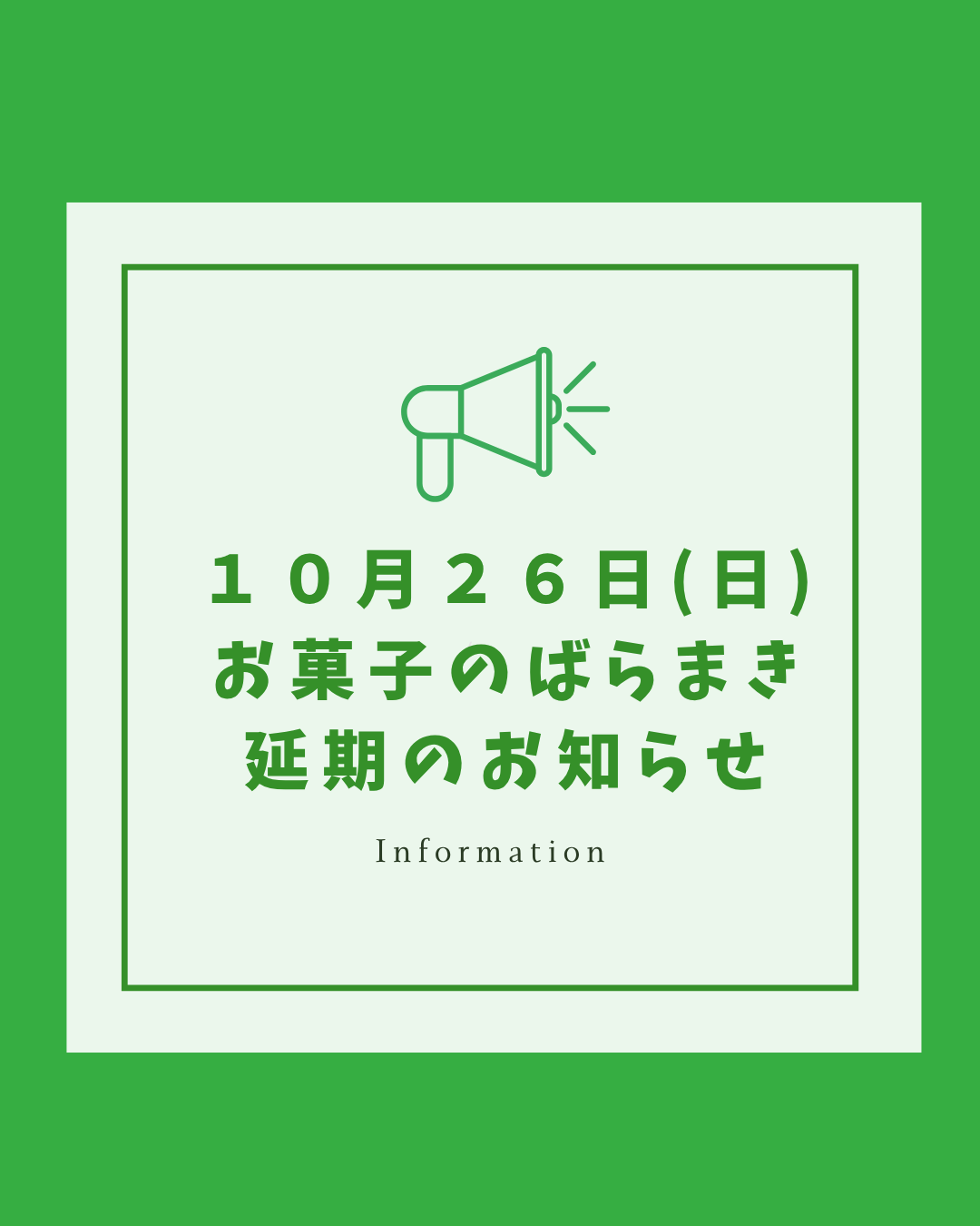 10月26日(日)13:00からお菓子のばらまきを企画していましたが、当日悪天候が予想されるため延期とさせていただきます。