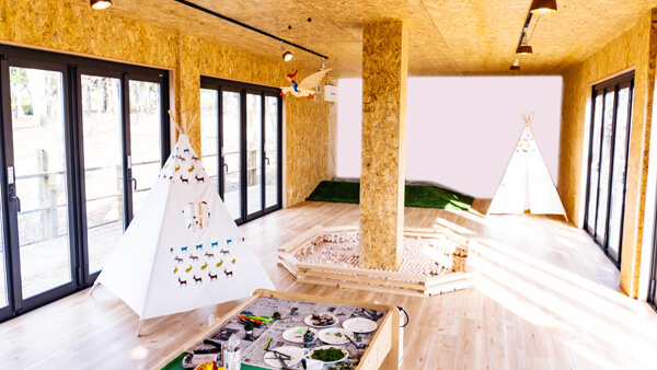 5歳未満の小さなお子様でも、木に触れて楽しむことができる室内空間です。木育の要素をたくさん盛り込んだ、木の香りただよう空間です。